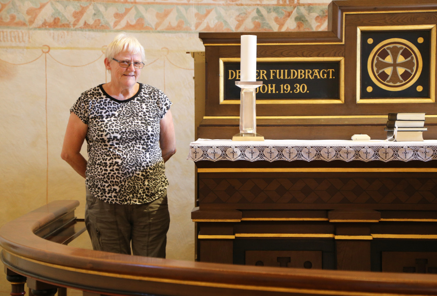 En fin ny kniplet dug til alteret, efter alterets restaurering skulle dugen være lidt mindre så guldkanten på alteret kunne ses.